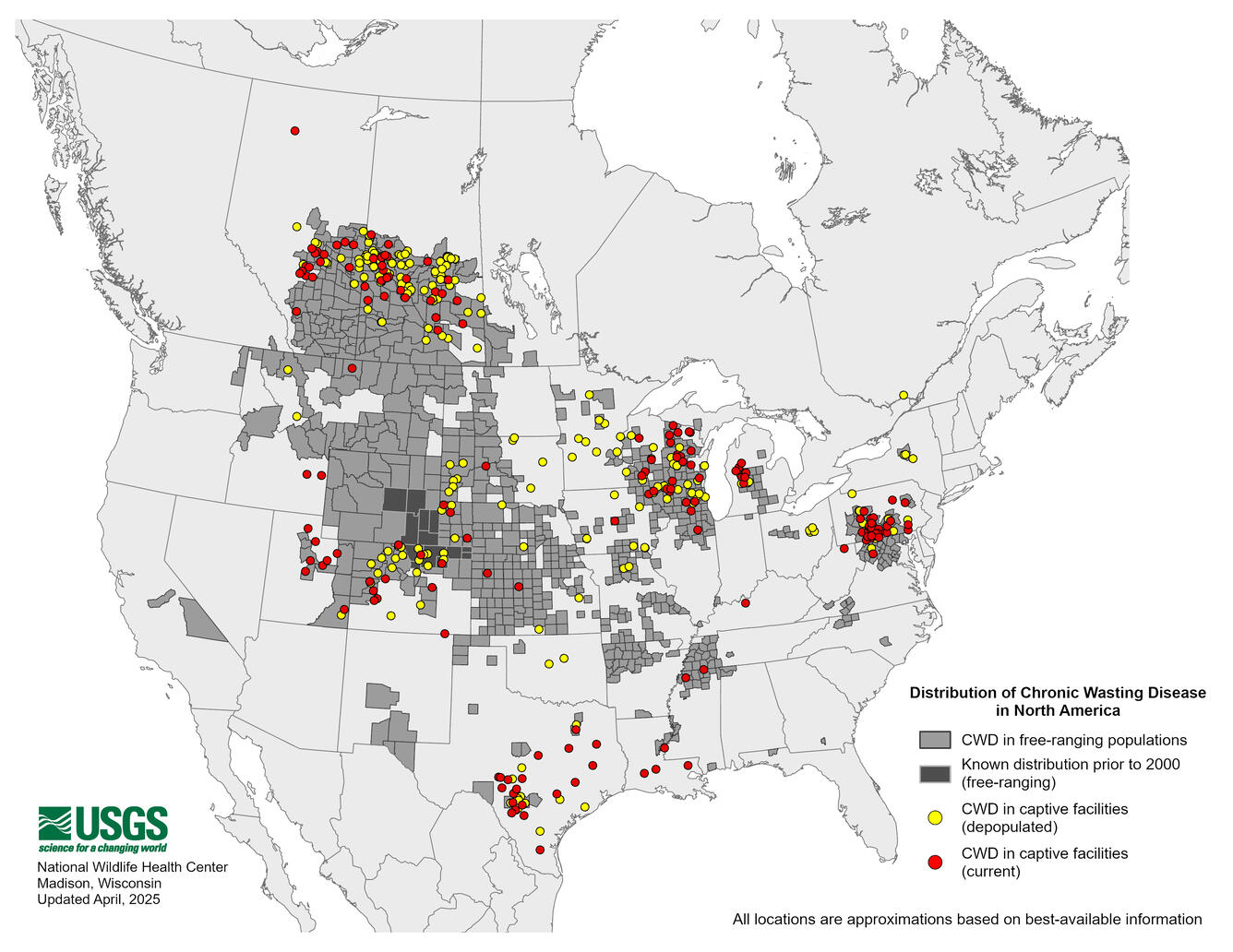 Distribution of Chronic Wasting Disease in North America, updated April 11, 2025.